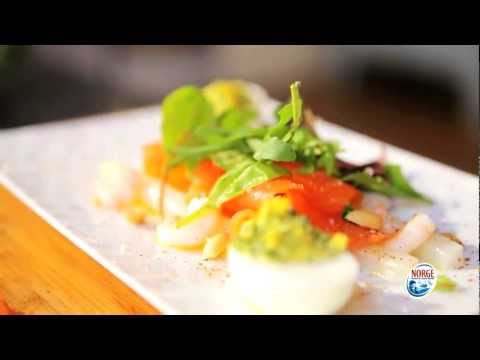 Mimosa Vinaigrette }}- Pour un repas savoureux, et frais, optez pour cette recette de Saumon de Norvège fumé accompagné d'asperges en vinaigrette et de ses œufs mimosa.